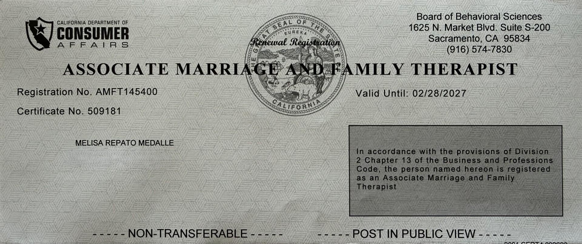Melisa Medakke is a Registered Associate Marriage and Family Therapist, AMFT #145400 employed by Psychotherapist.Coach: A Marriage and Family Therapist Corp. She is supervised by Lynndal Daniels, LMFT #78183.