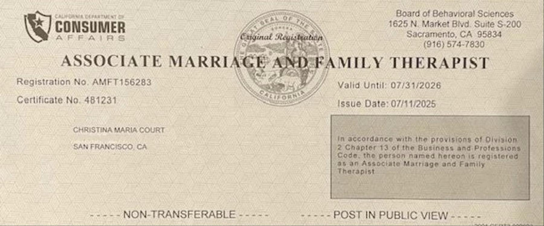 Christina is a Registered Associate Marriage and Family Therapist, AMFT #156283 employed by Psychotherapist.Coach: A Marriage and Family Therapist Corp. She is supervised by Lynndal Daniels, LMFT #78183.